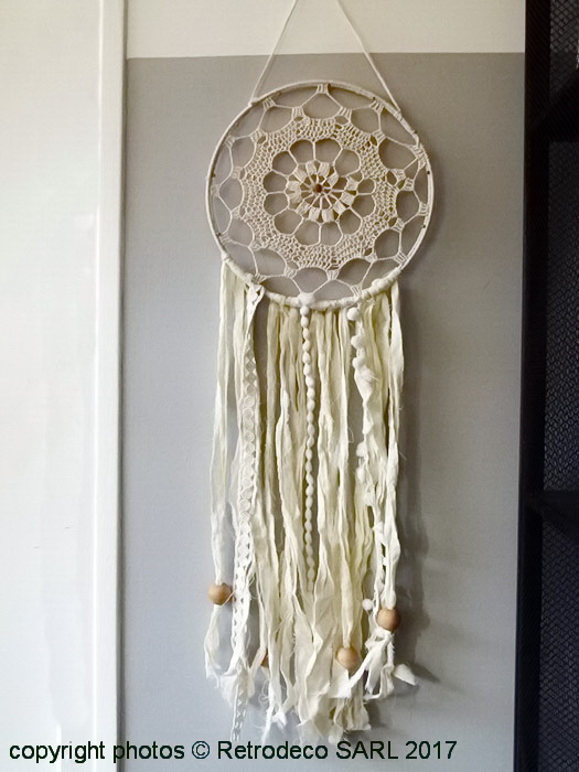On aime cet attrape-rêves en crochet de coton, rubans et perles de bois de chez Madam Stoltz à disposer sur un mur pour une déco d’ambiance bohème. Dans la culture amérindienne, l’attrape-rêves éloigne les mauvais rêves. Dimensions : Diam (25cm) – Hauteur (88cm).