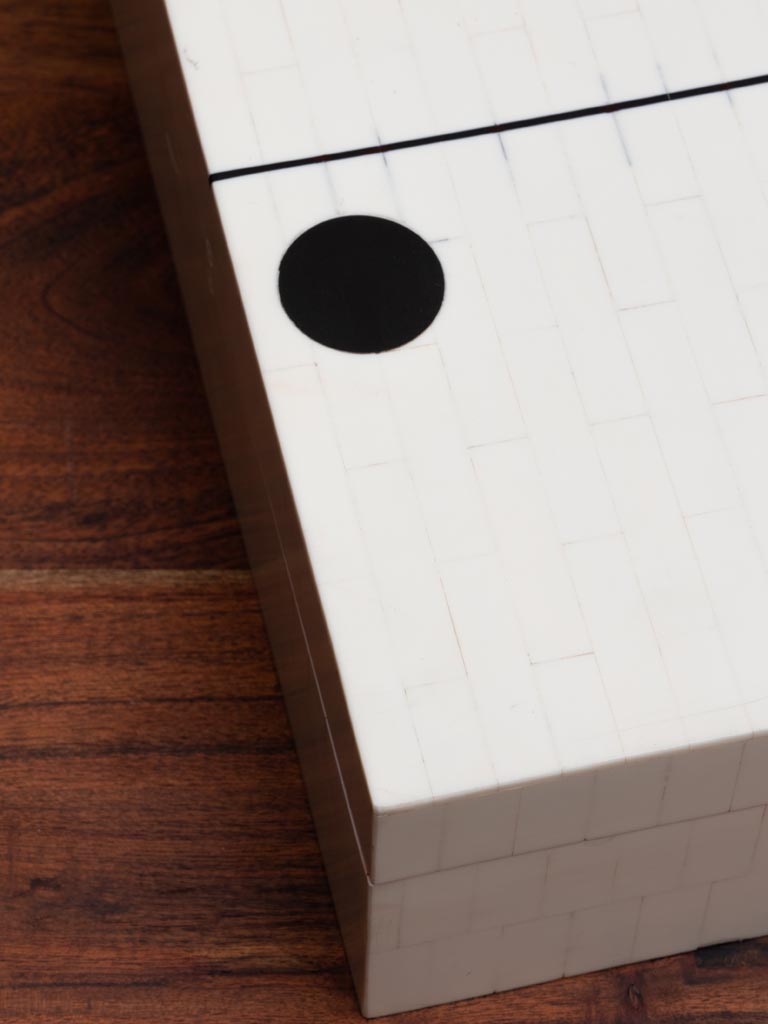 Ensuite, cette boîte à dominos s’inscrit parfaitement dans une déco vintage chaleureuse et équilibrée. Elle rappelle les accessoires de jeux traditionnels présents dans les salons et cabinets anciens. Toutefois, son style reste simple et harmonieux, sans surcharge décorative. Les lignes épurées mettent en valeur la qualité de fabrication et la finition soignée. De plus, le contraste entre le blanc de la résine et la profondeur du design crée un effet visuel élégant. Ainsi, elle s’accorde aisément avec des meubles patinés, du bois naturel ou des éléments en métal. Par ailleurs, elle peut également servir de boîte de rangement décorative pour d’autres objets du quotidien. Son esthétique intemporelle traverse les tendances sans perdre de son attrait. L’objet participe à une ambiance accueillante et conviviale, idéale pour les salons ou les espaces de loisirs. Il enrichit la décoration tout en restant pratique et fonctionnel.