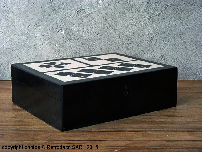 Très belle boite de jeux en bois laqué compartimentée comprenant un jeux de cartes, 1 gobelet et cinq dés et un jeu de 28 dominos. Elle sera aussi utile que décorative et fera un très bel effet sur une table basse. Une excellente idée cadeau. Une création ambiance déco brocante de chez Chehoma. Dimensions : 19cm – 14.5cm – 6cm./li>
