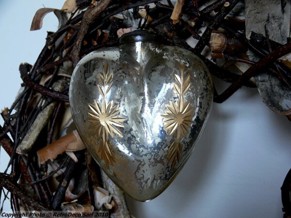 Déco Noël avec cette boule mercurisée forme coeur et sa guirlande de fleurs couleur or à suspendre dans votre sapin de chez Chehoma. Dimensions : 11cm – 10cm.