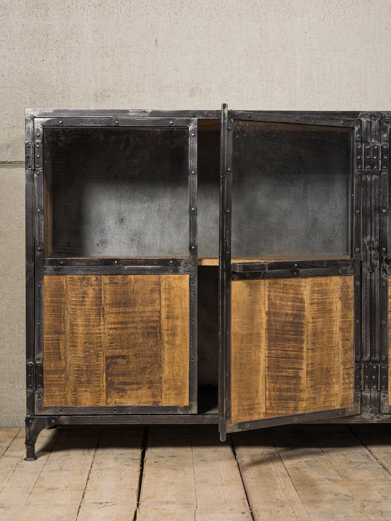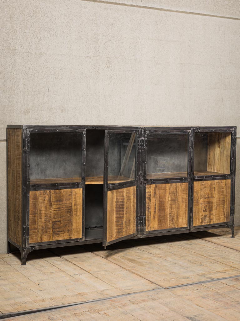 On craque pour ce grand Buffet 4 portes Revol déco atelier Chehoma en manguier structure métal. Il offre de nombreux rangements grâce à ses 8 niches protégées par 4 portes semi-vitrées. On aime la patine et la solidité des matériaux, qui renforcent son côté industriel. Buffet 4 portes Revol déco atelier signé Chehoma. Dimensions : L202cm – P40cm – H102cm. Précision: appeler pour vérifier la disponibilité.