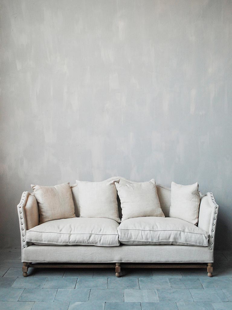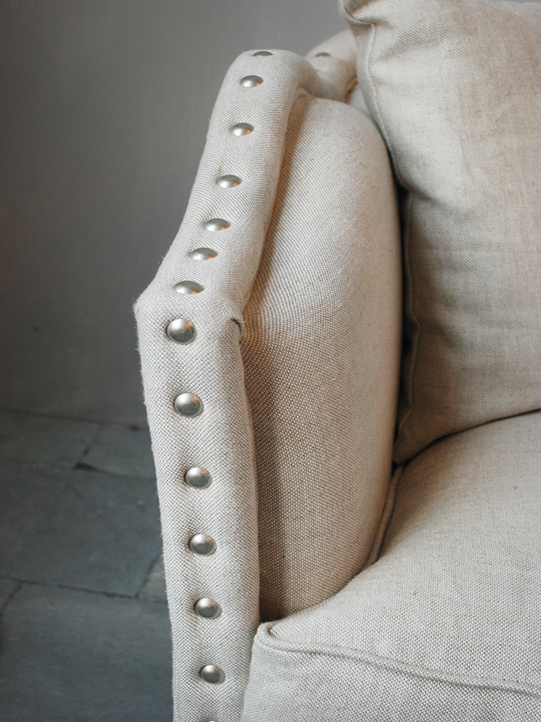 On aime la finition cloutée et le dossier en arabesque de ce canapé Marie-Antoinette en lin naturel qui trouvera toute sa place dans un intérieur aussi bien contemporain que classique. Un canapé authentique et confortable avec des coussins déhoussables en plumes et mousse. Canapé Marie-Antoinette Chehoma. Piètement en noyer. Densité : 35kg/m3. Dimensions : L206cmxP90cm – h93cm. Précision: appeler pour vérifier la disponibilité.