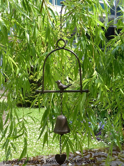 Ce carillon en métal avec son oiseau sur sa balançelle et son petit coeur sera se faire entendre au gré de la brise avec son joli carillon. A suspendre sur votre terrasse, balcon ou dans votre jardin. Une création ambiance déco campagne Antic Line. Dimensions : Largeur (19cm) – Hauteur (19cm).