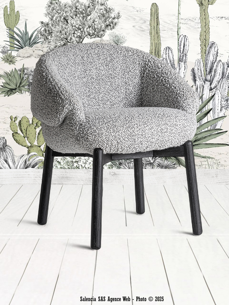 La chaise Jacquard modèle 8 de Vical est une création unique qui attire immédiatement l’attention. Dès le premier regard, on remarque son design enveloppant et son style graphique. Grâce à ses lignes épurées et à sa structure en Orme, elle s’intègre parfaitement dans une déco campagne chic. De plus, la combinaison de la base noir et gris avec le tissu gris chiné apporte une touche d’élégance discrète. Ainsi, cette Chaise Vical devient un élément central dans n’importe quelle pièce.