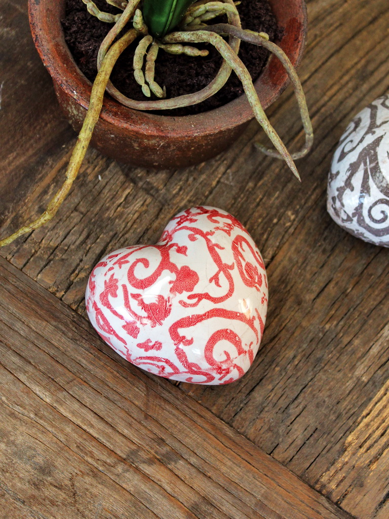 Coeur en céramique craquelée motif fleurs rouges, qui pourra s’utiliser comme simple objet de déco ou comme presse-livres dans une bibliothèque ou un bureau. On aime le motif style guirlande de fleurs et la patine de la céramique un peu craquelée. Une création vintage et brocante de Sphere Inter. Dimensions: Diamètre 9cm Hauteur 5cm