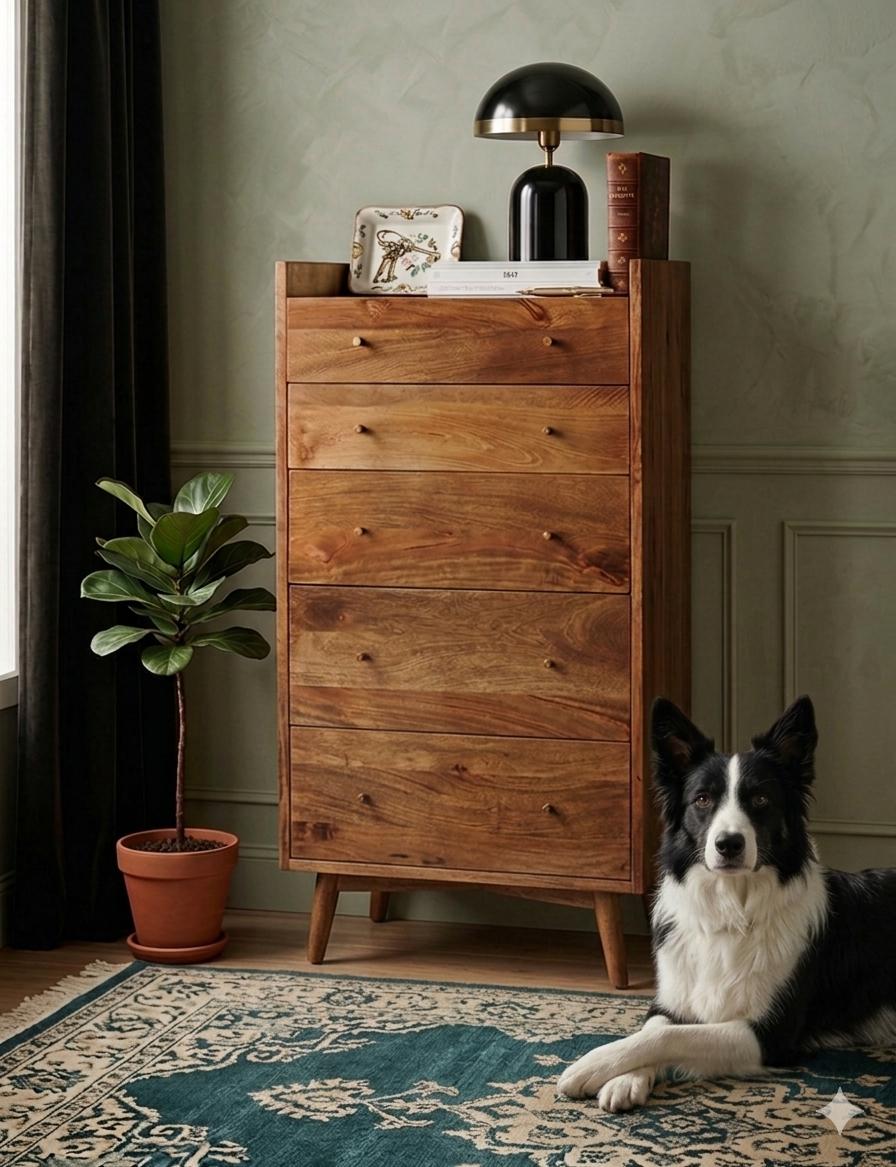 Le design de la commode Niccolo se caractérise par ses lignes classiques et son architecture élégante. Sa hauteur permet de l’intégrer facilement dans des espaces variés tout en offrant un espace de rangement généreux grâce à ses tiroirs spacieux. Le manguier, réputé pour sa robustesse, assure une solidité durable, tandis que le laiton ajoute des détails raffinés qui captent la lumière et accentuent le design vintage. La couleur marron du bois s’harmonise parfaitement avec le laiton doré, créant un effet visuel à la fois chic et chaleureux qui s’intègre harmonieusement dans des décors inspirés du passé.