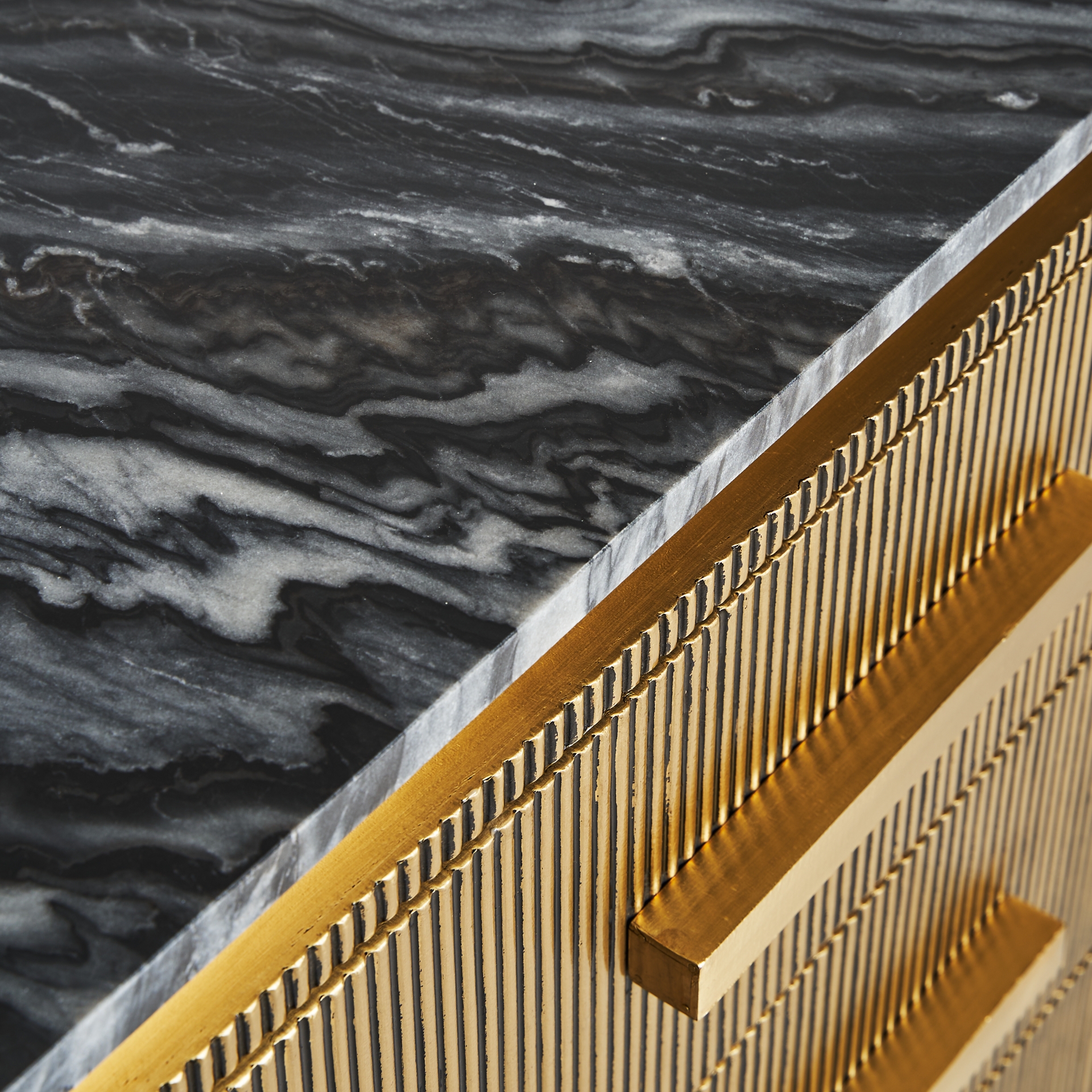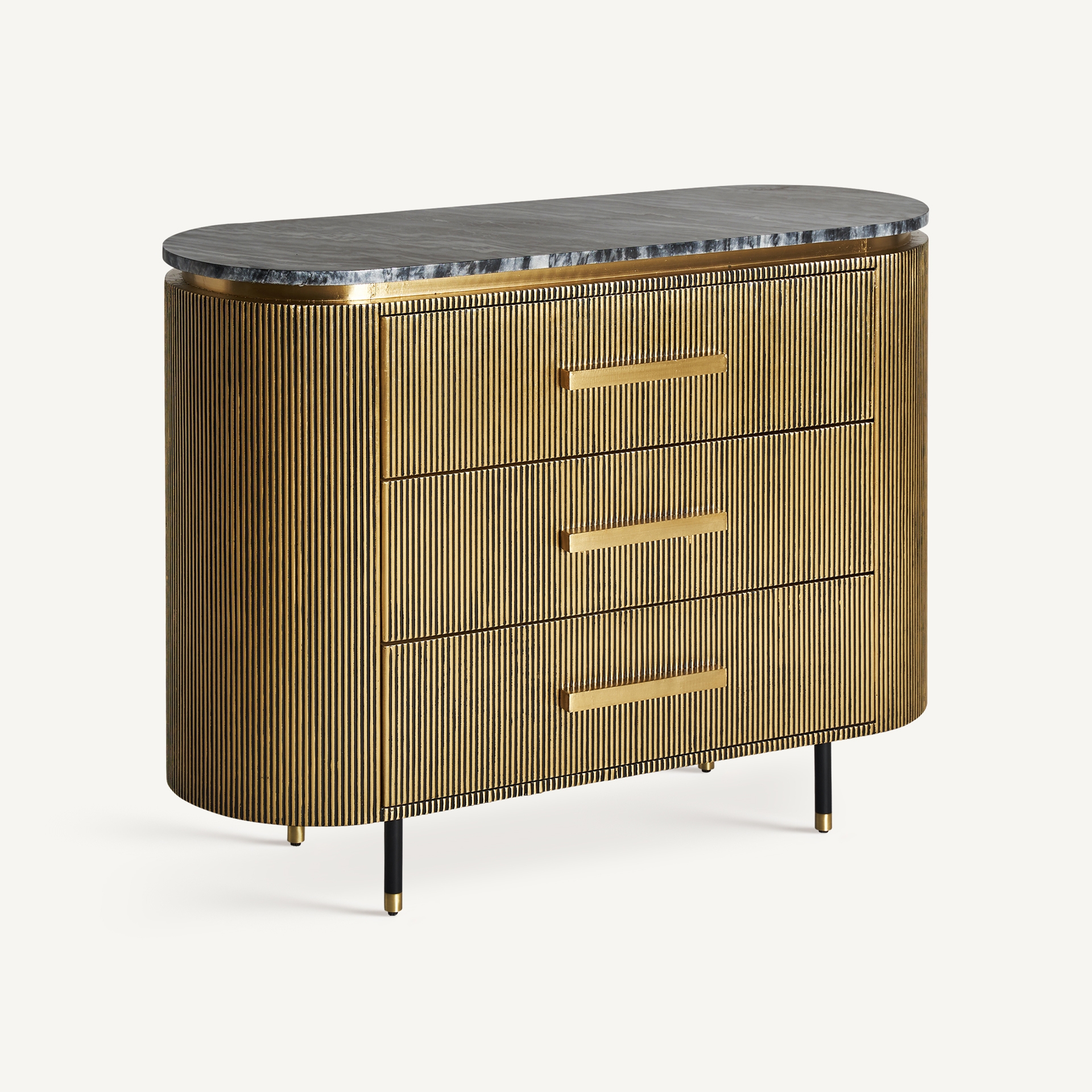 La commode Valbruna de la marque Vical marie à la perfection le style vintage avec des matériaux haut de gamme tels que le métal et le marbre. Son dessus en marbre noir et blanc apporte une élégance incomparable, tandis que ses poignées en métal doré ajoutent une touche luxueuse à l’ensemble.