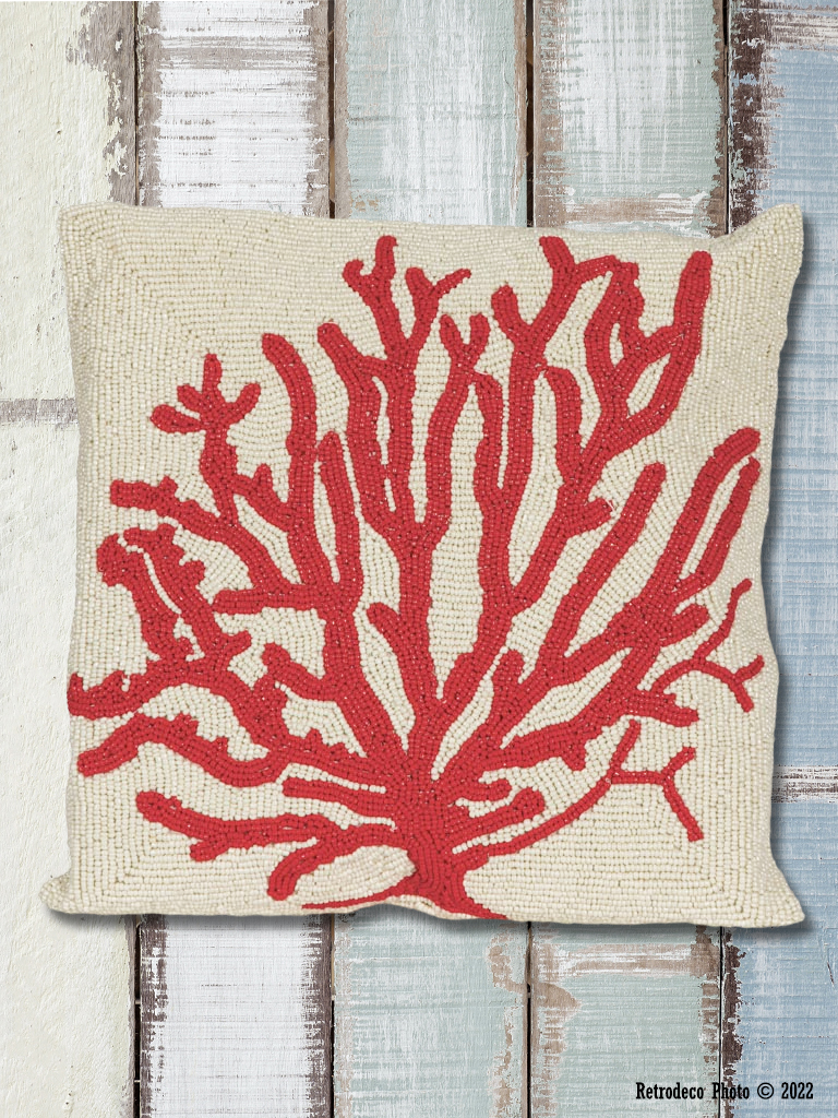 Coup de coeur pour ce coussin carré Corail brodé entièrement de perles de verre. Original, il apportera une touche bord de mer à votre intérieur. Dos en coton écru. Déhoussable (fermeture par zip). Garniture polyester. Lavage main. Dimensions : 35cm – 35cm.