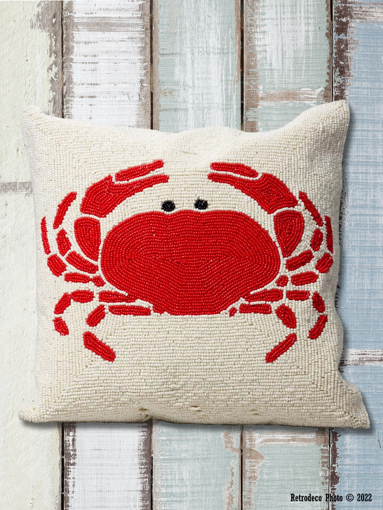 Coup de coeur pour ce coussin carré Crabe brodé entièrement de perles de verre. Original, il apportera une touche bord de mer à votre intérieur. Dos en coton écru. Déhoussable (fermeture par zip). Garniture polyester. Lavage main. Dimensions : 35cm – 35cm.