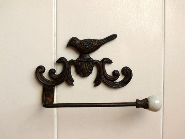 Dérouleur de papier toilette en fonte patinée motif « oiseau » et sa boule en céramique pour une ambiance déco brocante. Dimensions : 24cm – 5cm – 13cm.