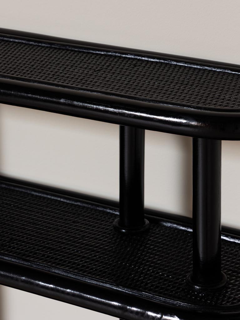 Dans un salon, une entrée ou une chambre, l’étagère murale Black Pigmento trouve naturellement sa place. En effet, sa structure en Rotin apporte une texture organique qui adoucit les lignes d’un mur. De surcroît, sa teinte noir permet de créer un contraste harmonieux avec des matières naturelles comme le bois clair, les fibres ou la céramique. On peut également l’associer à des objets artisanaux pour renforcer l’esprit déco ethnique chic. Grâce à son design ouvert, elle offre un espace de rangement décoratif qui met en valeur livres, plantes ou objets personnels. Ainsi, elle devient un élément polyvalent qui s’intègre dans de nombreux environnements. Son style affirmé permet de structurer un mur tout en conservant une esthétique légère.