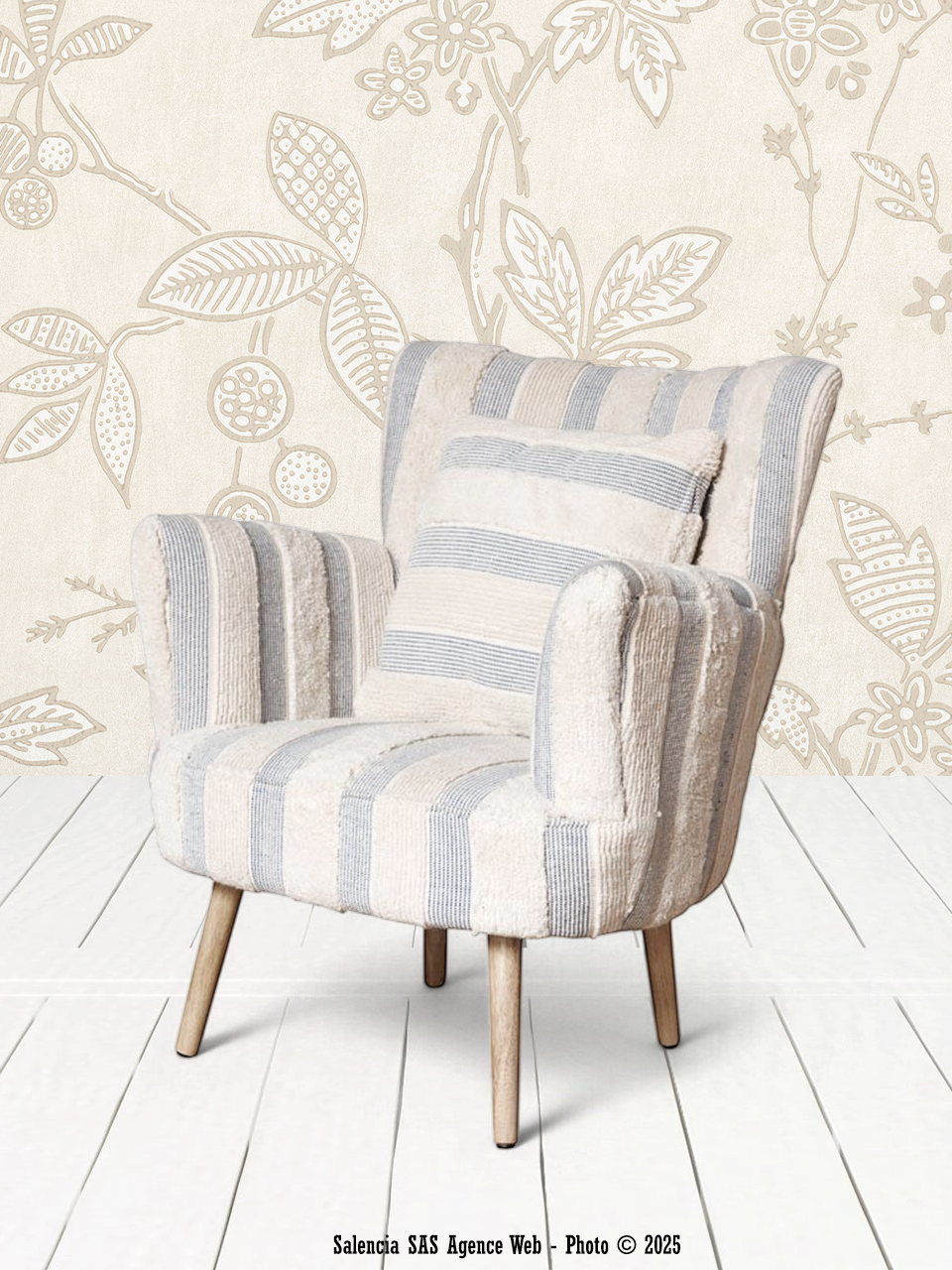 Avec son design inspiré des fauteuils d’époque, le fauteuil rayé Harina s’intègre harmonieusement dans une ambiance vintage ou bohème. Son mariage entre le manguier et le coton lui confère une esthétique authentique et un charme unique. Son assise spacieuse et ses accoudoirs arrondis offrent un confort optimal, idéal pour de longs moments de détente. Que ce soit dans un salon, une chambre ou un bureau, il apporte une touche colorée et originale à votre décoration. Ce fauteuil allie parfaitement esthétique et fonctionnalité, s’imposant comme une pièce incontournable pour un intérieur au style affirmé et chaleureux.