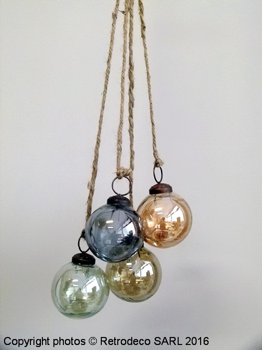 Coup de coeur pour cette grappe de 4 petites boules de noël en verre de couleurs différentes patine lustré de chez Madam Stoltz. On aime son lien en grosse ficelle de chanvre qui lui donne tout son caractère authentique. Cette grappe de boules de Noël accessoirisera parfaitement votre déco de fêtes de fin d’année. Dimensions avec le lien : Hateur (37cm) – Dimensions boule : Diam (5cm).