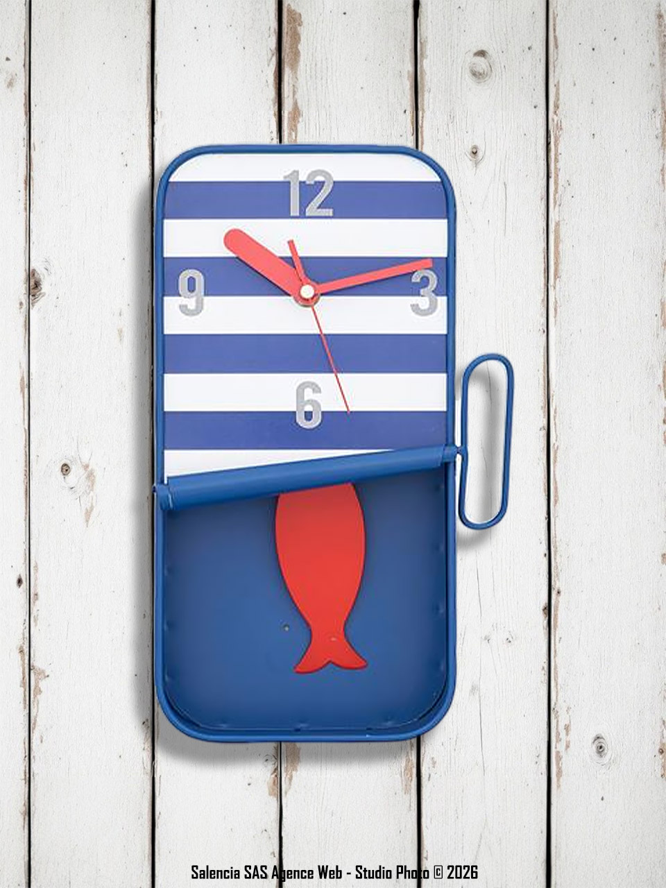 Enfin, choisir une création signée Batela traduit un goût pour les détails soignés et l’esprit marin. En effet, la marque propose des collections harmonieuses inspirées du littoral. Ainsi, l’horloge Boîte de Conserve s’associe facilement à d’autres accessoires assortis. De plus, son design original apporte relief et charme sans surcharger l’espace. Par conséquent, elle enrichit chaque pièce avec subtilité et fraîcheur. Grâce au Métal, elle conserve solidité et allure durablement. En outre, l’alliance du Blanc et du Bleu reste élégante et lumineuse. Ainsi, chaque intérieur gagne en cohérence visuelle et en charme. Par ailleurs, l’esprit déco bord de mer valorise l’ensemble de la pièce, de ce fait cette horloge Batela constitue un choix pratique, esthétique et durable.