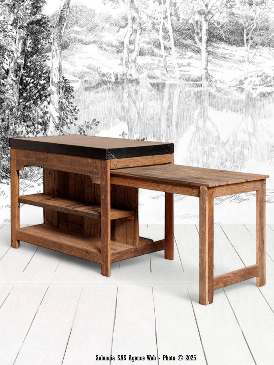 Le marbre noir confère à cet îlot de cuisine Chehoma un aspect noble et intemporel, tandis que le bois recyclé apporte une touche chaleureuse et naturelle. La partie coulissante est un atout majeur, vous permettant d’agrandir la surface de travail ou de repas en un clin d’œil. Cela le rend idéal pour les cuisines ouvertes ou les espaces multifonctionnels où l’optimisation de l’espace est essentielle. Le contraste entre le marron du bois et le noir profond du marbre crée un effet visuel saisissant, ajoutant à la fois caractère et sophistication.