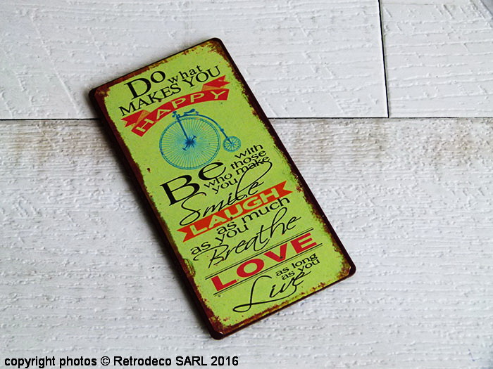 Magnet en métal patiné Do what make you happy…, à mettre sur un pêle-mêle ou frigo pour une ambiance déco scandinave. Dimensions : L5cm – h10cm.