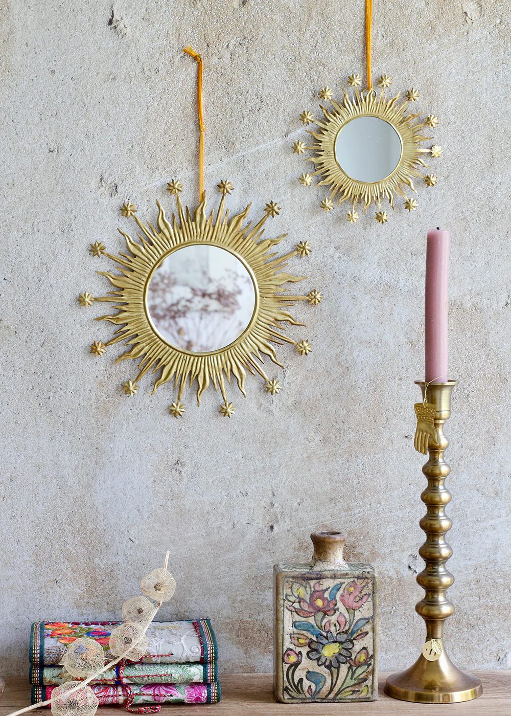 LeMiroir doré Soleil et étoiles petit, de la marque Weldaad, apporte une touche de luminosité à tous les intérieurs. Ce miroir en métal doré s’inspire de la forme solaire, avec des rayons éclatants et de jolies étoiles filantes ciselées sur le tour du cadre. Fait à la main en Inde, chaque pièce est unique et témoigne d’un savoir-faire artisanal minutieux. De plus, le petit format s’adapte facilement aux espaces réduits, tandis que la disponibilité en tailles medium et large permet de répondre à tous les besoins déco. Ce miroir Weldaad peut être intégré dans un salon, une entrée ou même une chambre pour réfléchir la lumière et agrandir l’espace.