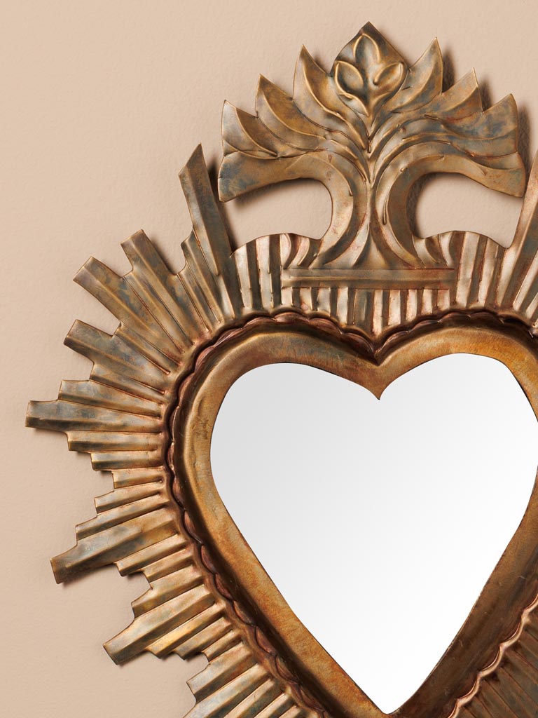 Le miroir Ex-voto strié patine bronze de Chehoma s’impose comme une pièce forte, presque théâtrale, dans un intérieur. Sa forme de cœur sacré, entouré de rayons striés, évoque les anciens ex‑voto que l’on trouvait dans les chapelles ou les intérieurs bourgeois. Les stries régulières captent la lumière et la dirigent vers le centre, où le miroir renvoie une image légèrement dramatique. Cette présence puissante en fait un point focal idéal pour une ambiance de déco cabinet de curiosités, où chaque objet semble chargé de sens et d’histoire personnelle.