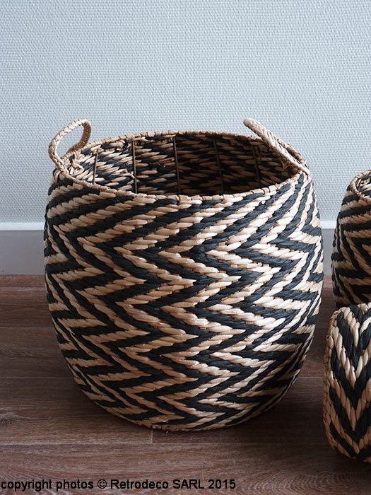 Coup de coeur pour cette grande panière en jacinthe d’eau motif zig-zag couleur noire et naturelle pour tout ranger et cela dans toutes les pièces de votre maison (jouets, linge, etc..). Sa structure métallique visible de l’intéreur permet à cette panière de bien garder sa forme. Vous pouvez également y mettre une plante. Une création Madam Stoltz. Dimensions sans les anses : Diam (46cm) – Hauteur (38cm).