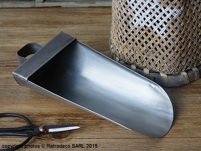Petite pelle à graines en métal galva patiné zinc antique qui vous sera bien utile au jardin. Une création Ib Laursen. Dimensions : 20cm – 9.5cm – 5cm.