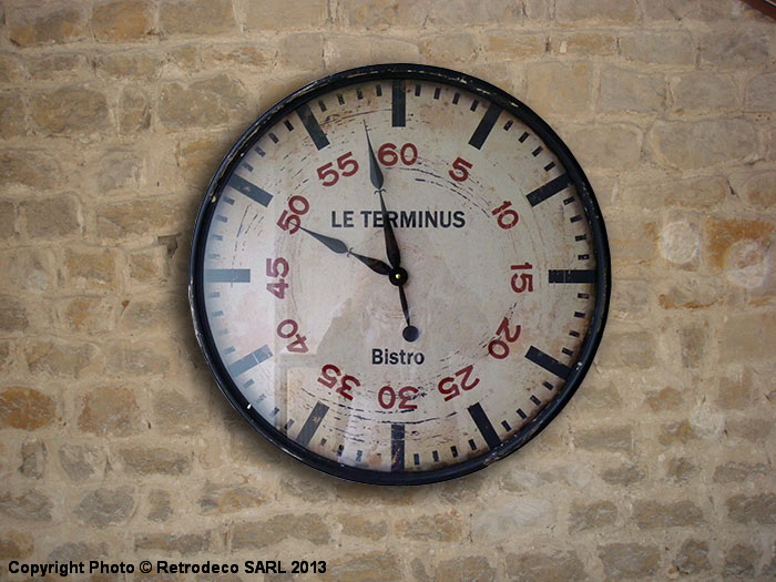 Coup de coeur pour cette pendule en métal patiné noir Bistro Le Terminus, nous rappelant les pendules de gare. Une création Antic ambiance déco industrielle ou atelier. Une excellente idée cadeau. Fonctionne avec une pile LR6. Dimensions : Diam (60cm) – Profondeur (8cm).