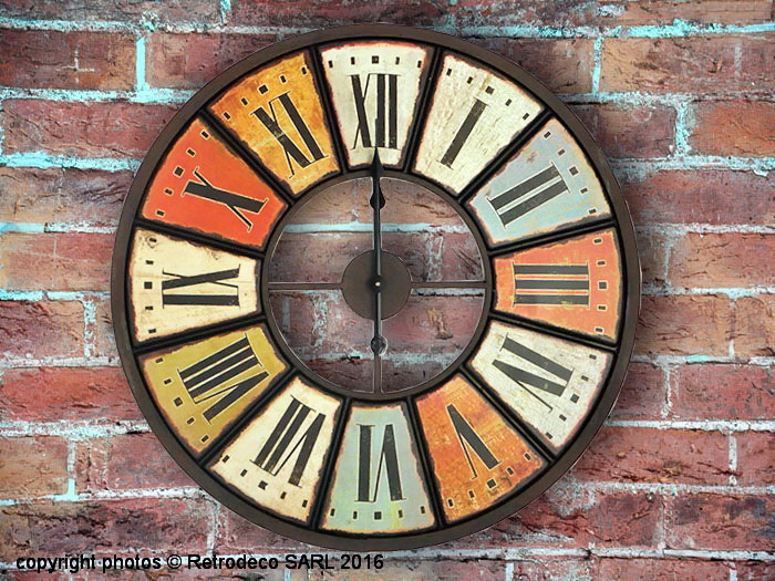 Cette grande pendule multicolore en bois et métal patiné rouille s’intégrera dans beaucoup d’ambiances déco (brocante, atelier, bord de mer, etc…). Fixez-la sur un mur, elle l’habillera complètement. Une création Antic Line. Fonctionnne avec une pile LR6. Dimensions : Diam (74cm) – Profondeur (2.8cm). Note: Appeler pour vérifier la disponibilité.