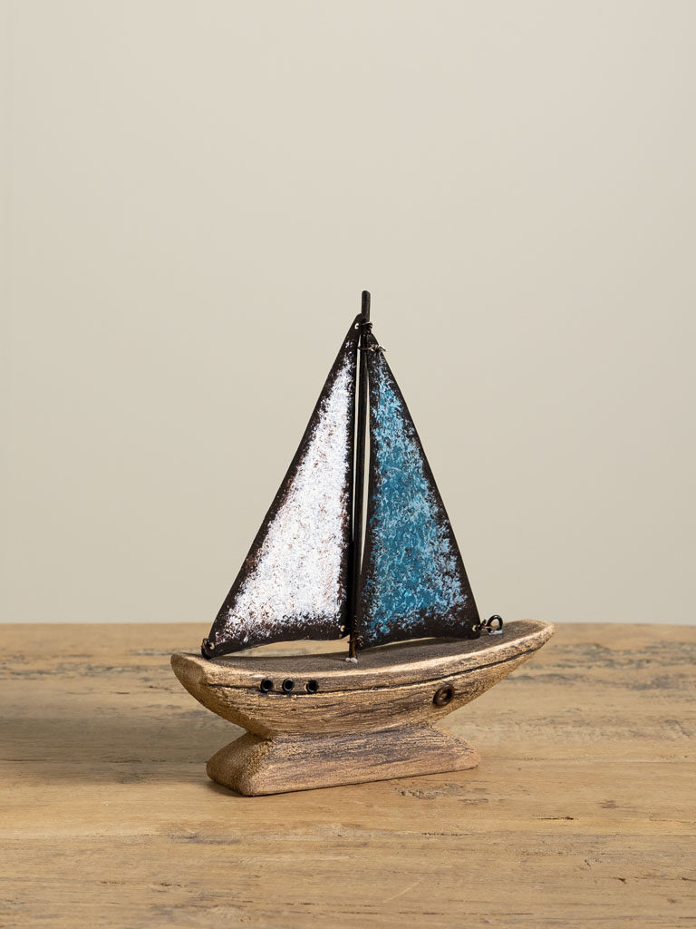 Le petit bateau voile en fer bleue de Chehoma semble prêt à prendre le large depuis le coin d’une étagère. Sa coque épurée repose sur un socle en Paulownia, bois léger et chaleureux, qui évoque immédiatement les pontons ensoleillés et les planches patinées par le sel. La voile stylisée, découpée dans un métal fin, se dresse avec élégance et capte la lumière, dessinant une ombre douce sur le mur. La couleur Bleu, profonde et légèrement passée, rappelle les horizons marins et installe d’emblée une atmosphère de déco bord de mer simple et apaisante.