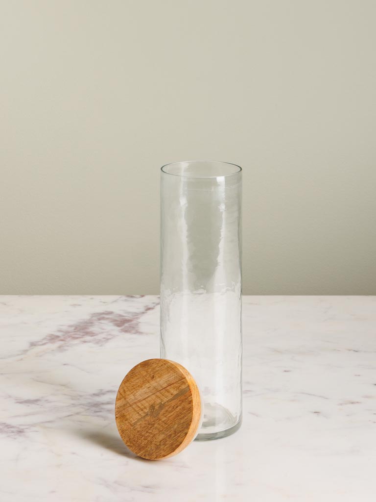 Par ailleurs, l’utilisation du verre martelé confère à ce bocal une allure artisanale et raffinée, tout en garantissant une grande robustesse. Contrairement aux contenants classiques, ce modèle se distingue par ses reliefs délicats qui captent la lumière et apportent une note d’originalité à votre décoration. Le couvercle en manguier est non seulement élégant, mais aussi parfaitement hermétique, ce qui permet de préserver la fraîcheur et la qualité de vos aliments ou accessoires. Ainsi, que vous choisissiez de l’exposer sur une étagère de cuisine ou dans une salle de bain, ce bocal s’adapte à toutes les pièces et à tous les styles, tout en répondant à vos besoins de rangement.