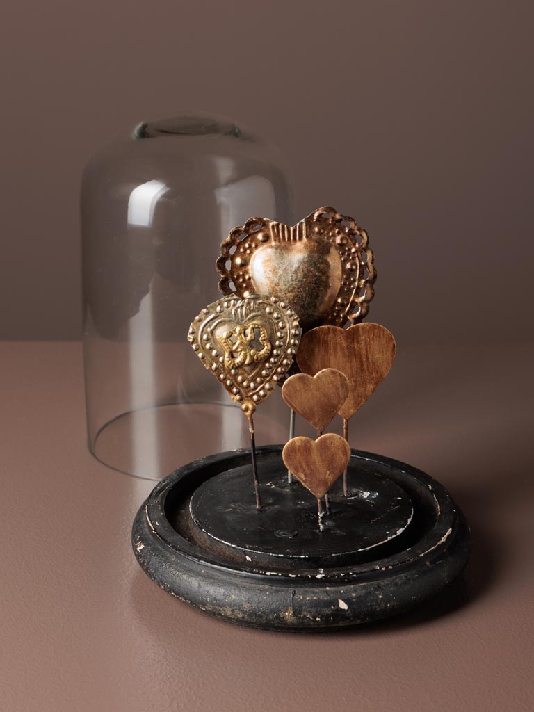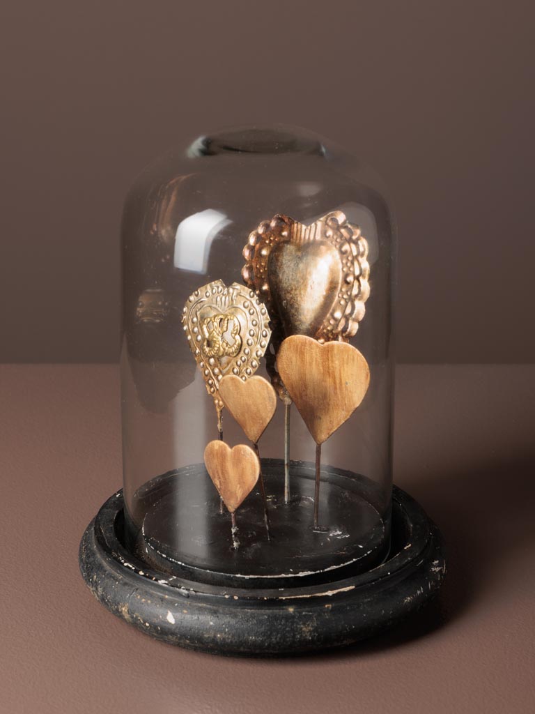 De plus, le petit dôme et coeurs Ex-voto séduit par son harmonie chromatique et sa richesse de contraste. La transparence du verre magnifie les reflets doré des détails, tandis que la base en manguier naturel renforce l’authenticité de l’ensemble. Les touches noir apportent profondeur et élégance, conférant à la pièce une allure à la fois ancienne et contemporaine. Ce Dôme Chehoma illustre l’art d’associer beauté spirituelle et sophistication décorative. Placé sur une console, une étagère ou au centre d’un buffet, il devient un point focal captivant. Dans un intérieur au style inspiré de la déco cabinet de curiosités, il dialogue à merveille avec les objets de collection et les éléments d’art ancien. Chaque cœur Ex-voto, soigneusement disposé, raconte l’émotion du geste artisanal et le charme du symbole intemporel. L’ensemble évoque une prière figée dans la matière, un fragment de mémoire précieux.