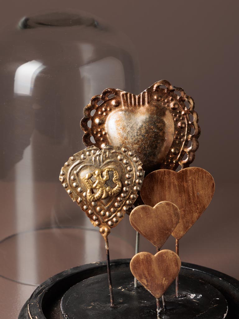 Véritable objet de fascination et d’élégance mystique, le petit dôme et coeurs Ex-voto signé Chehoma associe poésie, symbolisme et savoir-faire artisanal raffiné. Cette création décorative, inspirée de la tradition des cabinets de curiosités, réunit sous un dôme en verre une composition raffinée où chaque cœur doré s’impose comme un symbole d’émotion et de foi. Le socle en manguier sculpté apporte une chaleur naturelle, contrastant joliment avec les reflets noir et doré des éléments métalliques. L’ensemble évoque la beauté du précieux et du sacré, tout en sublimant la matière brute. Véritable œuvre d’équilibre, ce Dôme Chehoma s’intègre parfaitement à l’univers singulier de la déco cabinet de curiosités, où se mêlent objets rares et fragments d’histoire. Sa dimension intime et spirituelle attire le regard comme une invitation à la contemplation.