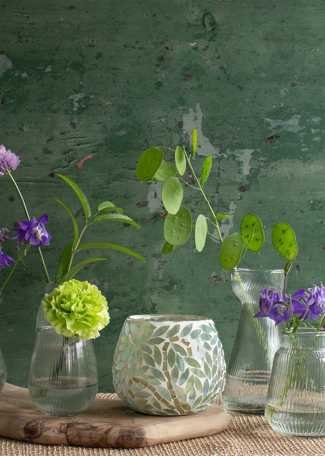 De plus, ce photophore verre mosaique vert séduit par sa capacité à s’harmoniser avec différents matériaux. Les petits fragments de verre assemblés en mosaïque créent une texture subtile qui capte la flamme sous des angles variés. La couleur vert, tantôt douce, tantôt plus profonde selon l’intensité de la lumière, se marie particulièrement bien avec le bois flotté, le rotin ou les textiles naturels. Placé au cœur d’une composition de déco bord de mer mêlant galets, cordages et coquillages, ce Photophore Weldaad renforce l’impression de vacances perpétuelles et de confort simple.