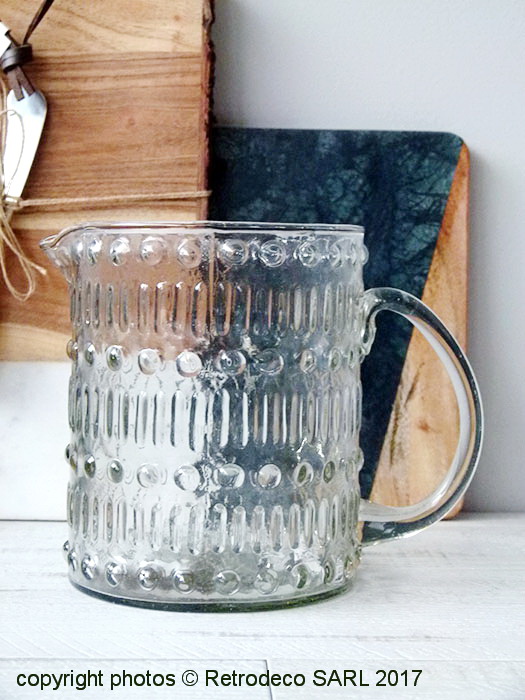Coup de coeur pour ce pichet en verre assez large. On aime son motif pois et rayures en relief. Un petit pichet Madam Stoltz qui peut être détourné de vase pour un beau bouquet de fleurs. Compatible lave-vaisselle. Dimensions : Diam (12cm) – Hauteur (15cm).