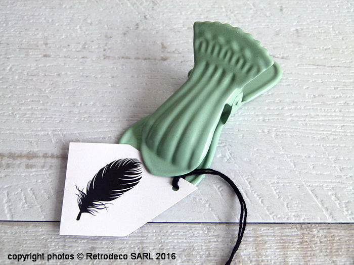 Pince à papier en métal vert clair bien pratique afin de ne rien perdre à poser sur votre bureau ou à fixer au mur. Une création ambiance déco scandinave de chez Madam Stoltz. Existe également en blanc, bleu vert et zinc. Dimensions : 9.5cm – 4cm.