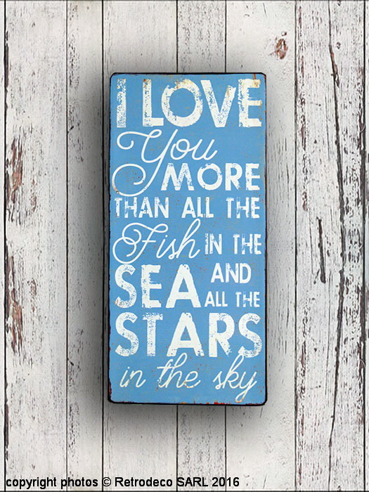 Coup de coeur pour cette plaque en métal patiné I love you more than all the fish in the sea and all the stars in the sky. Une excellente idée cadeau. Deux accroches au dos. Dimensions : L13cm – h30.5cm.