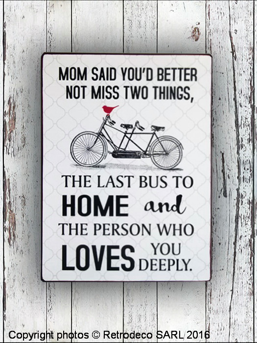 Plaque décorative Mom said you’d better not miss two things, the last bus to home and the person who loves you deeply. Une excellent idée cadeau. Dimensions : L26.5cm – h35cm.