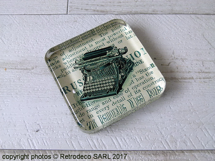 Presse-papier carré en verre qui découvre une image bien vintage de machine à écrire. Idéal sur un bureau et une belle idée cadeau. Presse-papier Chehoma. Dimensions : L9.5cm – l9.5cm – h2cm.