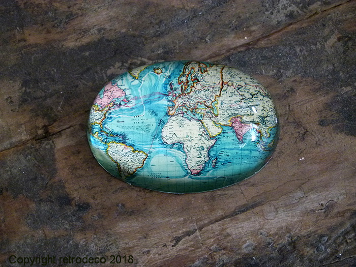 Presse-papier oval en verre qui découvre une image vintage de mappemonde. Idéal sur un bureau et une belle idée cadeau. Presse-papier Chehoma. Dimensions : L8.9cm – l6.3cm – h2.9cm.
