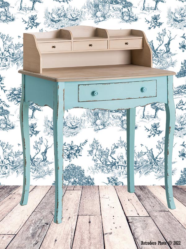 On aime la sobriété et l’élégance de ce pupitre Leiden en bois patiné bleu-vert. Peu encombrant, ce petit bureau assez étroit trouvera sa place aussi bien dans une entrée que dans un salon ou une chambre. Son look classique et sobre vous permettra de l’installer dans des ambiances déco aussi bien moderne que brocante. Ses quatre tiroirs et ses quelques niches vous permettront de ranger des papiers et ustensiles de bureau. Bureau Leiden collection Lastdeco. Dimensions : L80cm – P55cm – h103cm. Précision: appeler pour vérifier la disponibilité.