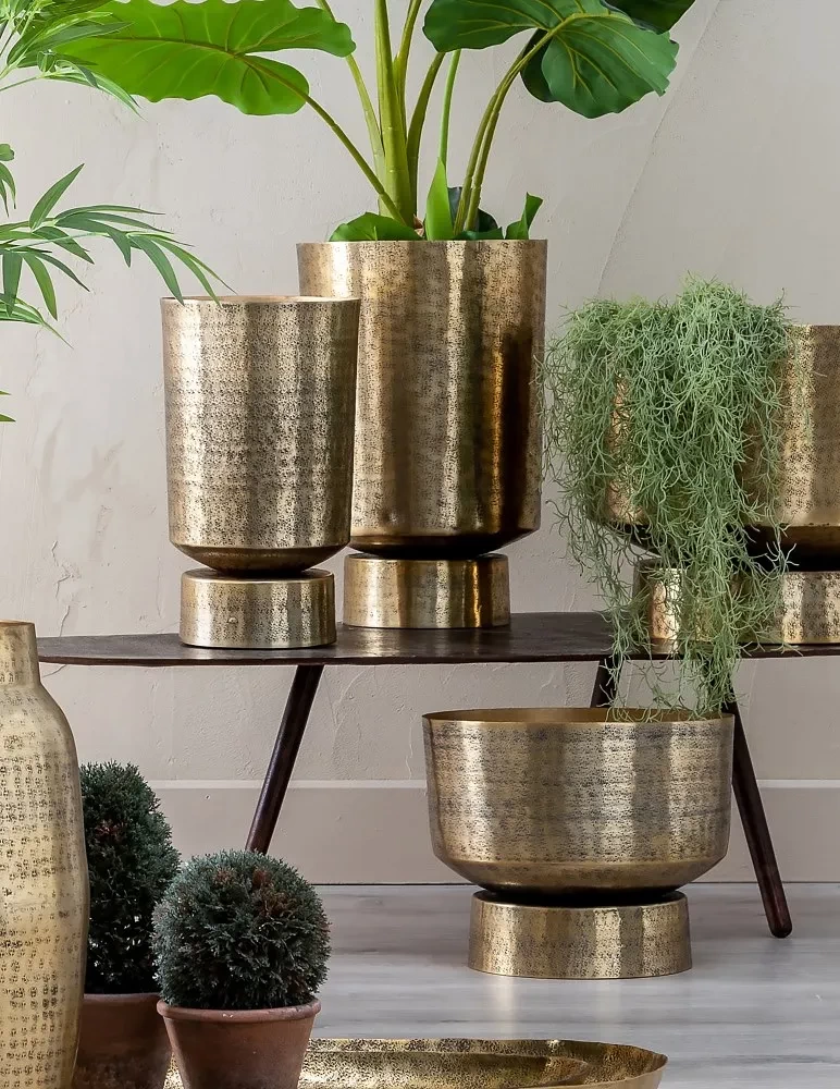 Ces vases ne sont pas seulement des objets décoratifs, ils sont également fonctionnels et polyvalents. Le set de 2 vases or Hilia peut accueillir des fleurs fraîches, des branches séchées ou même rester vide pour servir de sculptures décoratives. Leur matériau en aluminium assure une grande durabilité tout en étant léger, ce qui facilite leur déplacement et leur réagencement selon vos envies. La finition dorée de ces vases ajoute une touche de lumière et de glamour à votre intérieur, créant un point focal élégant et raffiné. Leur silhouette gracieuse et leur teinte chaleureuse se combinent pour évoquer une atmosphère à la fois exotique et moderne, parfaite pour ceux qui souhaitent incorporer des éléments de déco ethnique chic sans compromettre la sophistication de leur espace.