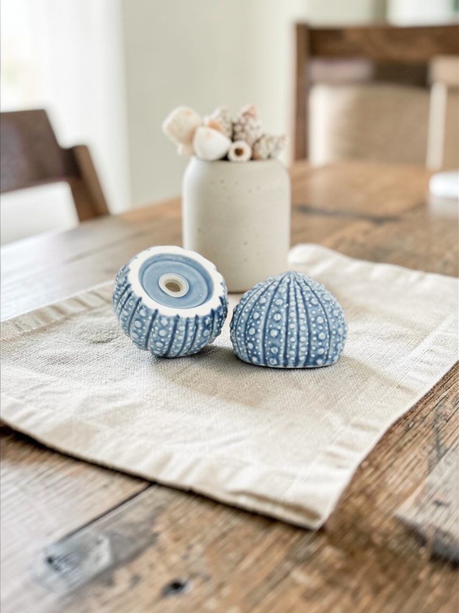 Ensuite, le set Salière et Poivrière Oursin séduit par sa praticité et son design fonctionnel. En effet, il permet de doser sel et poivre facilement et avec précision, ainsi il répond aux besoins d’un usage quotidien tout en restant décoratif. De plus, la matière en Dolomite garantit durabilité et résistance, par conséquent le set conserve son aspect neuf même avec une utilisation régulière. Grâce à la teinte Bleu, il apporte une touche marine et harmonieuse sur toutes les tables. En outre, il peut s’associer à d’autres accessoires de la collection Batela pour créer un ensemble cohérent, ainsi il structure visuellement la table tout en ajoutant charme et élégance. De même, son style déco bord de mer favorise une ambiance estivale et conviviale, par ailleurs le salière poivrière Batela devient un objet décoratif pratique.