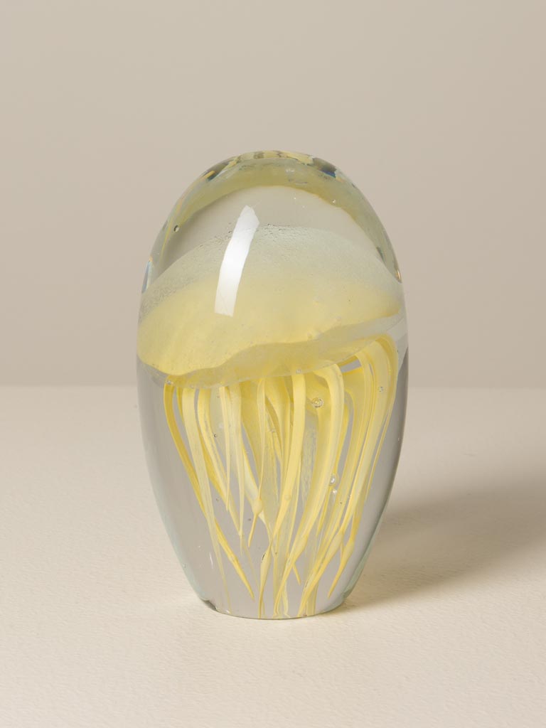 Le sulfure méduse jaune clair imaginé par Chehoma apporte une touche marine et délicate à tout intérieur. Sa structure en Verre lui confère une transparence raffinée, tandis que sa teinte jaune évoque les nuances douces de la lumière filtrée par l’eau. Ce Sulfure Chehoma s’intègre parfaitement dans une déco bord de mer, où les objets inspirés de l’océan occupent une place essentielle.