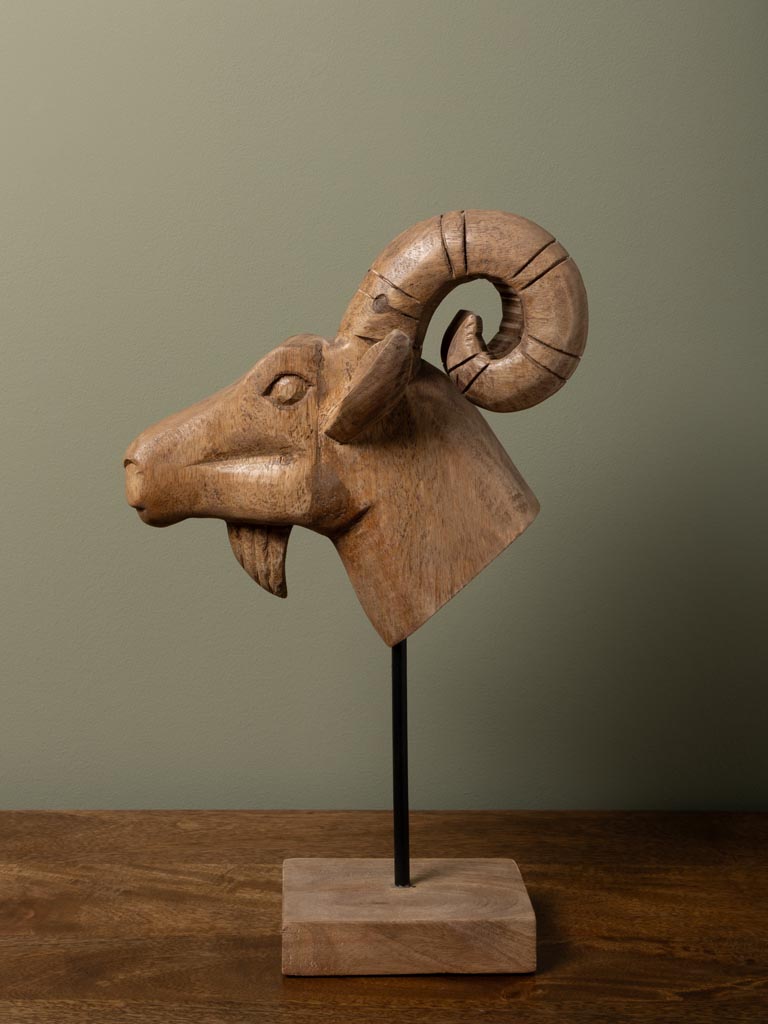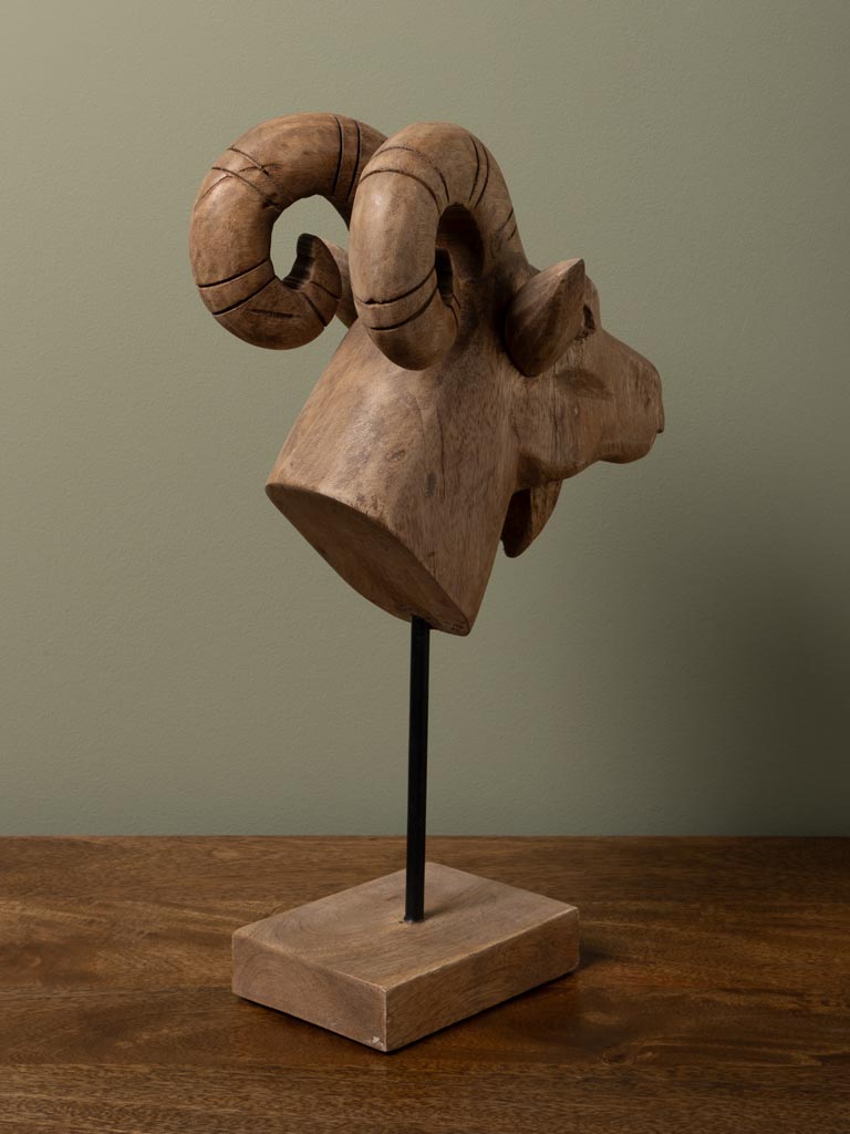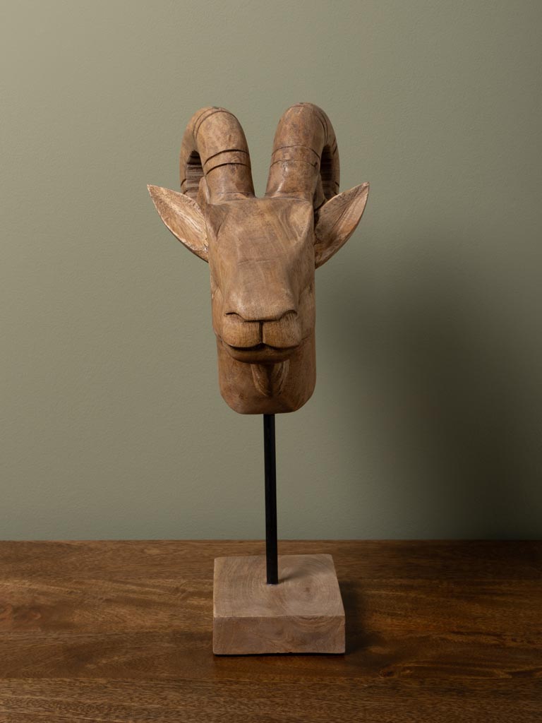 La tête de bouc manguier naturel de Chehoma impose d’emblée sa présence, entre esprit ferme et poésie rustique. Sculptée dans un bloc de Manguier, elle met en valeur le veinage chaleureux de ce bois, avec ses nuances dorées et ses légères irrégularités qui racontent l’arbre. Les cornes, longuement étirées, accentuent la verticalité de la pièce et lui donnent une allure presque totemique. Montée sur un support discret en métal, la sculpture se dresse comme un emblème, idéale pour structurer une ambiance de déco campagne chic à la fois raffinée et pleine de caractère.