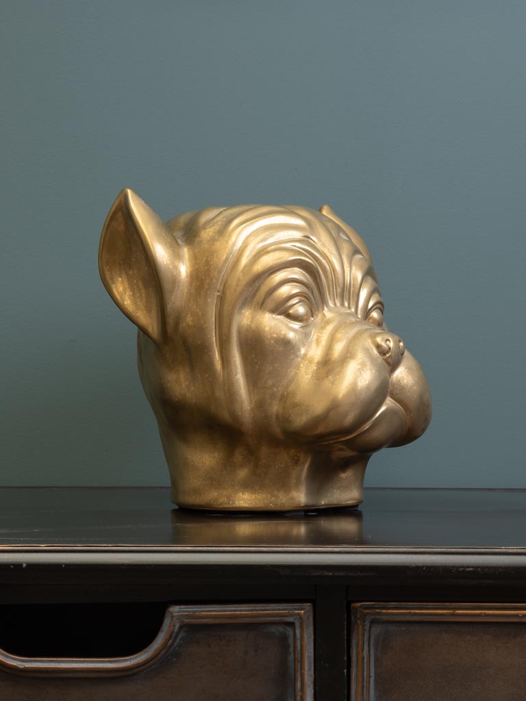 Par ailleurs, la tête de bulldog dorée grès trouve facilement sa place dans différents univers, ce qui la rend très polyvalente. Dans une entrée, posée sur une console en bois brut, elle donne tout de suite le ton : esprit maison de campagne, mais avec une pointe d’humour et de sophistication. La base en Ceramique lui assure une belle stabilité, tandis que le fini Doré se marie aussi bien avec des patines claires qu’avec des teintes plus profondes comme le vert olive ou le bleu encre. Sur un buffet, elle peut côtoyer vases en grès, bougies, paniers en osier et bouquets de fleurs séchées, composant une scène chaleureuse typique de la déco campagne chic. Dans un bureau ou une bibliothèque, elle devient un clin d’œil décalé, comme un compagnon silencieux qui observe les lectures et les moments de travail.