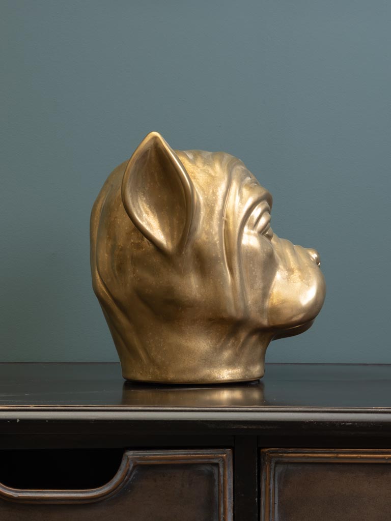 La tête de bulldog dorée grès de Chehoma impose immédiatement son caractère et devient la star du meuble sur lequel elle trône. Sa mâchoire carrée, son museau légèrement plissé et son regard concentré captent le moindre rayon de lumière et donnent l’impression que l’animal veille sur la pièce. Réalisée en Ceramique, elle montre un modelé précis, agréable à l’œil comme au toucher, avec juste ce qu’il faut de relief pour accrocher les ombres. Sa finition intensément Doré apporte une note lumineuse qui fait vibrer l’ensemble, parfaite pour réveiller une ambiance de déco campagne chic où les matières naturelles occupent le premier rôle.